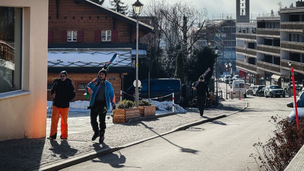 Eine Familie mit Poussette schlendert über die Place des Charmettes in Crans. Sie sprechen Englisch, sind offenbar Touristen. Sie kreuzen einen Mann, die Skier geschultert. Seine Skischuhe klackern über den Platz. Das Wetter in Crans-Montana – ideal für die Piste.